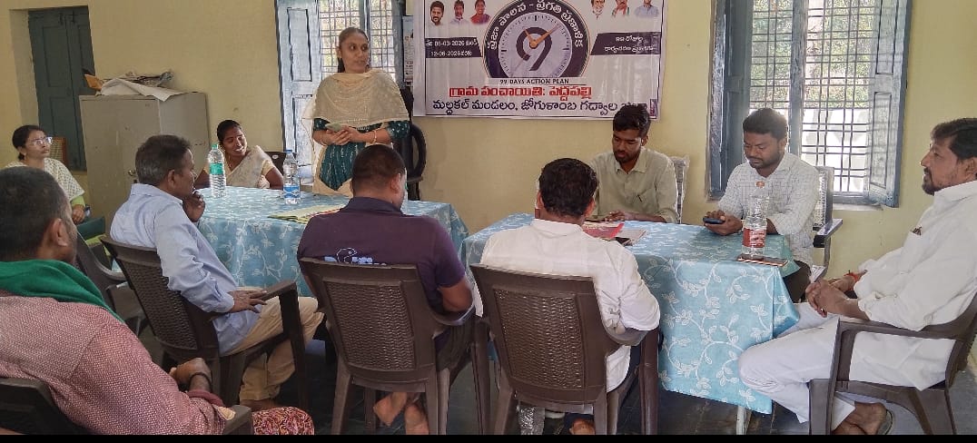 99 రోజులు10సూత్రాలుసమగ్రాభివృద్ధికి మార్గాలుప్రజా పాలన-ప్రగతి ప్రణాళి క'లో భాగంగా 10 కీలక అంశాలతో రేవంత్ సర్కార్ కార్యాచరణలో భాగంగానేడు జోగులాంబ గద్వాల జిల్లా అమలకల్ మండల పరిధిలోని పెద్దపల్లి గ్రామంలో ప్రజా పాలన-ప్రగతి ప్రణాళిక కార్యక్రమానికి శ్రీకారం చుట్టారు.ఈ సందర్భంగా -గ్రామ సర్పంచ్ అల్వల శిరీష మాట్లాడుతూ ప్రజా పాలన-ప్రగతి ప్రణా ళిక కార్యక్రమంలో భాగంగా 99 రోజుల పాటు జరిగే కార్యచరణ విధానాన్ని అమలు చేసి గ్రామ